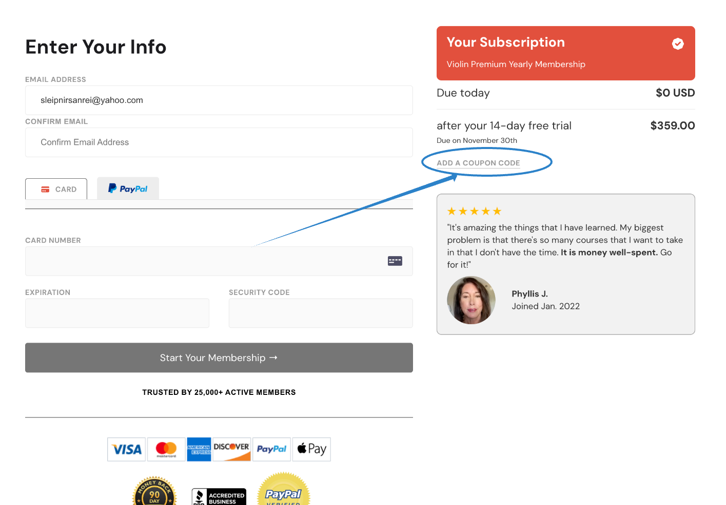 After entering your email address and selecting your plan type the checkout process will begin. In the payment details window, there is a form reading "ADD A COUPON CODE"